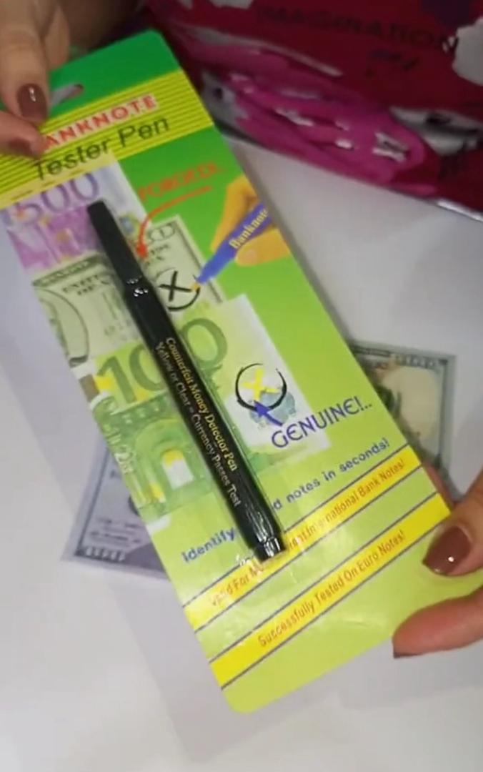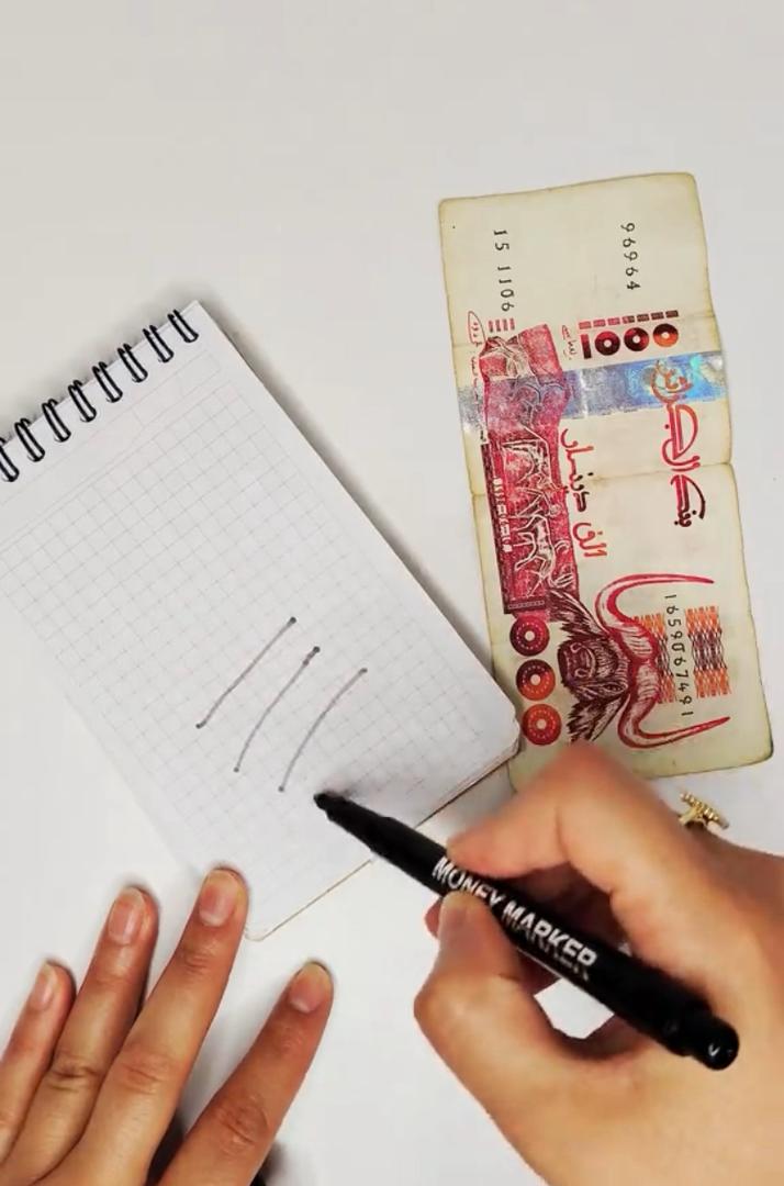 ببساطة مرّر القلم على الورقة أو العملة، فإذا تغيّر اللون أو ظهرت علامة، فهذا يعني أنها مزورة. أما إذا لم يتغير اللون، فالورقة أصلية.